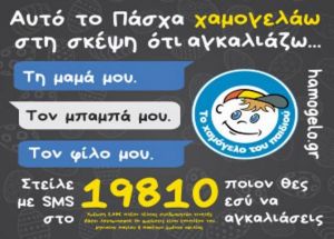 Από 10/4 έως και 26/4 καλούμε όλους εσάς να στείλετε SMS στο 19810* συμπληρώνοντας τη φράση: «Αυτό το Πάσχα Χαμογελάω στη σκέψη ότι Αγκαλιάζω…». και να μοιραστείτε μαζί μας, ποιον θέλετε να αγκαλιάσετε το Πάσχα.