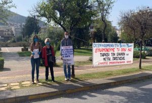 Τηρώντας όλα τα απαραίτητα μέτρα προστασίας με την ανακοίνωση στο χέρι, τις πικέτες και τα πανό.