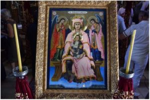 Έτσι ακριβώς έγινε και φέτος, υπό το ισχύον πλαίσιο, στον κατάμεστο Ι. Ναό της Αγίας Παρασκευής στην Κάτω Ηλιούπολη, αποδώσαμε τις δέουσες τιμές στην Παναγία Πεφανερωμένη, η εικόνα της οποίας, πιστό αντίγραφο της εικόνας της Μονής, παραμένει στη Λευκαδίτικη Στέγη, δέσποζε στο κέντρο του ναού. Η εικόνα πλαισιώθηκε από νέους και νέες που έφεραν τη λευκαδίτικη φορεσιά.