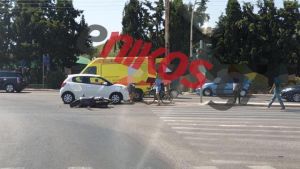 Στη σύγκρουση ενεπλάκησαν ένα ΙΧ αυτοκίνητο και μια μηχανή, ενώ στο σημείο έχει σπεύσει και ασθενοφόρο.