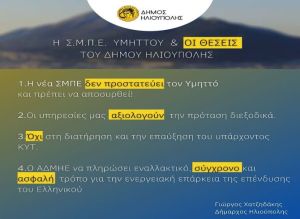 Αμέσως συγκλήθηκε το Σάββατο 18/7/2020 έκτακτο Δημοτικό Συμβούλιο με πρωτοβουλία μας, για να γίνει καταρχήν ενημέρωση για την ΣΜΠΕ και μια πρώτη εκτίμηση των διατάξεων της, που σχετίζονται με την πόλη μας και την προστασία του Υμηττού, όπου και τονίσαμε ότι: