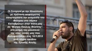 Τέλος, προτείνουμε την ονομασία του θεάτρου στο πάρκο Καλαβρύτων σε "θέατρο Παύλος Φύσσας", στη μνήμη του μουσικού της νέας γενιάς μας, που δολοφονήθηκε στις 18.9.2013 από τάγμα εφόδου της Χρυσής Αυγής.’’