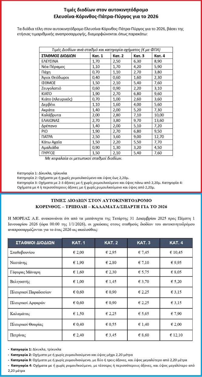 Στο μεταξύ, η Ολυμπία Οδός (Αθήνα-Πύργος) και ο Μορέας (Κόρινθος-Καλαμάτα/Σπάρτη), ανακοίνωσαν εξίσου αύξηση στις τιμές των διοδίων από την Πέμπτη 1 Ιανουαρίου 2026 (ώρα 00:00) λόγω της ετήσιας τιμαριθμικής προσαρμογής που εφαρμόζουν οι παραχωρησιούχοι των οδικών αξόνων.