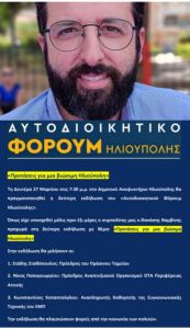 Τη Δευτέρα 27 Μαρτίου στις 7:30 μ.μ. στο Δημοτικό Αναψυκτήριο Ηλιούπολης θα πραγματοποιηθεί η δεύτερη εκδήλωση του «Αυτοδιοικητικού Φόρουμ Ηλιούπολης».