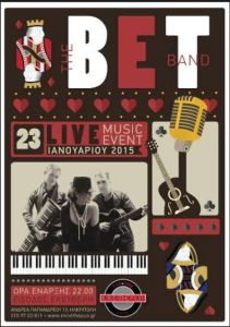 Tην Παρασκευη 23/1 στις 22 :00 σε μια παρεΐστικη ατμόσφαιρα με πολυ καλο φαγητο σε προσιτές τιμές οι "ΒΕΤ" θα παρουσιάσουν εξαιρετικές διασκευές σε ξένες και ελληνικές επιτυχίες όλων των εποχών που όλοι έχουμε αγαπήσει.