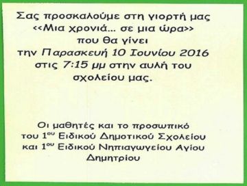 Αποχαιρετιστήρια γιορτή του 1ου Ειδικού Δημοτικού Σχολείου και του 1ου Ειδικού Νηπιαγωγείου, την Παρασκευή 10-6-2016 και ώρα 19:15.-