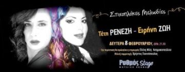 Η Ειρήνη Ζώη και η Τέτη Ρενέζη συνεβρίσκονται τη Δευτέρα, 8 Φεβρουαρίου 2016, στη σκηνή του Ρυθμός Stage, να παρουσιάσουν τη μουσική παράσταση «Στιχοπλόκες μελωδίες». Δύο σημαντικές ερμηνεύτριες, δύο σημαντικές φωνές, με σπουδές στο κλασικό και σύγχρονο τραγούδι αντίστοιχα, με πολλές δισκογραφικές συμμετοχές, θα μας παρασουσιάσουν αγαπημένα τους τραγούδια από την προσωπική τους δισκογραφία.