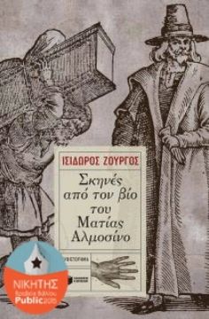Βραβείο Βιβλιοπωλείων Public στα «Βραβεία Βιβλίου Public 2015»Το μυθιστόρημα «Σκηνές από τον βίο του Ματίας Αλμοσίνο» είναι η ανοιχτή παλάμη ενός χεριού που ακουμπάει στον χάρτη της Ευρώπης του 17ου αιώνα ενώ κάθε δάχτυλο της αφήγησης δείχνει και σε διαφορετικό σημείο του ορίζοντα. Η Αγγλία του Νεύτωνα και της Βασιλικής Εταιρείας, το ανεξίθρησκο Άμστερνταμ των εμπόρων, η παγωμένη Πετρούπολη του τσάρου μεταρρυθμιστή, η Βενετία της μάσκας.