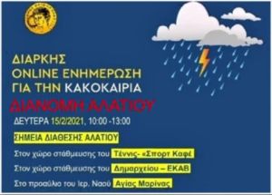 Δευτέρα 15/2/2021 από 10:00 έως 13:00 σε τρία σημεία της Ηλιούπολης κλιμάκια του Δήμου Ηλιούπολης θα διαθέτουν αλάτι στους κατοίκους για προληπτική χρήση κατά του πάγου, σε εισόδους και πεζοδρόμια.