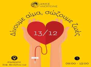 O Δήμος Ηλιούπολης συνεχίζοντας με συνέπεια το κοινωνικό του έργο, διοργανώνει την 63η Εθελοντική Αιμοδοσία σε συνεργασία με το Κέντρο Αιμοδοσίας του Περιφερειακού Γενικού Νοσοκομείου Αθηνών «Γεώργιος Γεννηματάς» και το Κέντρο Κοινότητας Δήμου Ηλιούπολης.
