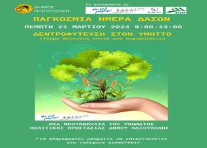 Την Πέμπτη 21 Μαρτίου 2024, Παγκόσμια Ημέρα Δασών, θα διεξαχθεί Δενδροφύτευση του Δήμου Ηλιούπολης σε συνεργασία με τον ΣΠΑΥ και το "ΌΛΟΙ ΜΑΖΙ ΜΠΟΡΟΥΜΕ" στον Υμηττό.