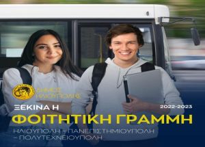 Από την Δευτέρα 3 Οκτωβρίου 2022, ξεκινά το καθημερινό δρομολόγιο της «Φοιτητικής Γραμμής» για την δωρεάν μεταφορά των φοιτητών της πόλης μας προς Πανεπιστημιούπολη και Πολυτεχνειούπολη, καταρχάς με ένα δρομολόγιο μόνο μετάβασης, τις εργάσιμες ημέρες.