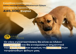Εγκρίθηκε η μελέτη του Δήμου Ηλιούπολης για κατασκευή καταφυγίου αδέσποτων ζώων συντροφιάς από το Πρόγραμμα «ΦΙΛΟΔΗΜΟΣ ΙΙ» του Υπουργείου Εσωτερικών, στο πλαίσιο της Πρόσκλησης ΧΙΙ με τίτλο «Κατασκευή καταφυγίου, προμήθεια εξοπλισμού και κτηνιατρικές υπηρεσίες για τη φροντίδα των αδέσποτων ζώων συντροφιάς» προϋπολογισμού 445.300,00 €.
