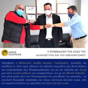 Δημιουργήσαμε τον Οκτώβριο του 2020 την «Ομάδα Νομικής Υποστήριξης», γιατί μέσα στην οικονομική κρίση της τελευταίας 10ετίας υπήρξαν πολλοί συνδημότες, που δεν μπόρεσαν να ανταποκριθούν στις υποχρεώσεις τους με αποτέλεσμα να κινδυνεύει η πρώτη κατοικία τους, από ηλεκτρονικούς πλειστηριασμούς.