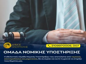 Ο Δήμος Ηλιούπολης συνεπής στη δέσμευσή του, για την πολλαπλή στήριξη των ευάλωτων συνδημοτών μας ανακοινώνει ότι η εθελοντική «Ομάδα Νομικής Υποστήριξης» που αποτελείται από νομικούς, οικονομολόγους και μηχανικούς, θα συνεχίσει και αυτή τη χρονιά να στηρίζει τους δημότες μας.