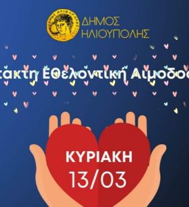 Έκτακτη Εθελοντική Αιμοδοσία διοργανώνει ο Δήμος μας την Κυριακή 13 Μαρτίου 2022, από 09:00 έως 13:00, στην Αίθουσα Συνεδριάσεων Δημοτικού Συμβουλίου «Κώστας Κονδύλης» του Δημαρχείου Ηλιούπολης, με είσοδο από Σοφοκλή Βενιζέλου 114, σε συνεργασία με το "Κέντρο Αιμοδοσίας Γενικού Νοσοκομείου Αθηνών Γ. ΓΕΝΝΗΜΑΤΑΣ".