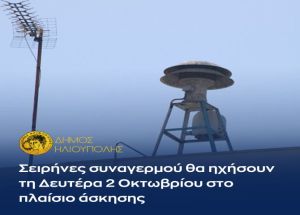 Ο Δήμος Ηλιούπολης ενημερώνει τους πολίτες ότι, ύστερα από γνωστοποίηση της ΕΛ.ΑΣ., τη Δευτέρα 2 Οκτωβρίου 2023 θα ηχήσουν σειρήνες συναγερμού σε όλη την επικράτεια, λόγω της άσκησης «Αντίχοος» του ΓΕΕΘΑ.