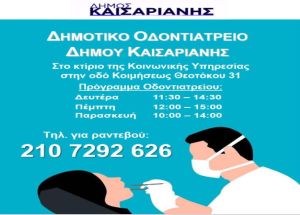 Το Δημοτικό Οδοντιατρείο του Δήμου Καισαριανής συνεχίζει να παρέχει δωρεάν οδοντιατρική περίθαλψη και φροντίδα σε όλους τους κατοίκους του Δήμου Καισαριανής, όλων των ηλικιών.