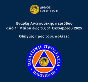 Ενημερώνουμε τους Δημότες & Κατοίκους του Δήμου Ηλιούπολης ότι από 01-05-2025 ξεκινάει η αντιπυρική περίοδος του έτους 2025 και θα λήξει στις 31-10-2025. Κατά τη διάρκεια της περιόδου αυτής θα πρέπει όλοι οι πολίτες που είναι ιδιοκτήτες οικοπέδων να προβούν σε όλες τις απαραίτητες ενέργειες για τον έγκαιρο καθαρισμό τους (Πυροσβεστική Διάταξη 20/2024) και οι ιδιοκτήτες κατοικιών που βρίσκονται εντός ή πλησίον δασικών εκτάσεων θα πρέπει να εφαρμόσουν αυτά που προβλέπονται από την (ΚΥΑ ΥΠΕΝ/ΔΑΟΚΑ/55904/2019, ΦΕΚ 3475/τ. Β΄/24.05.2023).