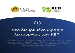 Από τη Δευτέρα 6 Σεπτεμβρίου 2021, ισχύει νέο διευρυμένο ωράριο λειτουργίας των ΚΕΠ του Δήμου Ηλιούπολης, για την καλύτερη εξυπηρέτηση των συμπολιτών μας.