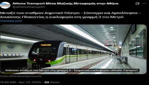 Η κυκλοφορία στη Γραμμή 3 του Μετρό διεξάγεται στα τμήματα Δημοτικό Θέατρο- Σύνταγμα και Αμπελόκηποι- Δουκίσσης Πλακεντίας.
