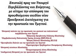 Επιστολή που απευθύνεται προς τον Υπουργό Περιβάλλοντος και Ενέργειας, με αίτημα την απόσυρση του προωθούμενου σχεδίου νέου Προεδρικού Διατάγματος για την προστασία του Υμηττού.