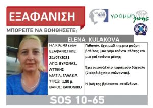 Η Elena Kulakova, 43 ετών, την 21/07/21 εξαφανίστηκε από την περιοχή του Βύρωνα, Αττικής.