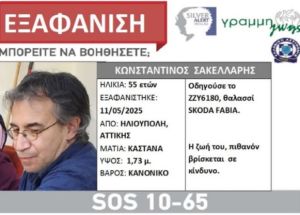Ο Κωνσταντίνος Σακελλάρης, 55 ετών, εξαφανίστηκε από το σπίτι του, στην Ηλιούπολη Αττικής, την 11-05-2025, όταν έφυγε με το αυτοκίνητό του μάρκας SKODA FABIA, χρώματος θαλασσί μεταλλικό, με αριθμό κυκλοφορίας ΖΖΥ6180, προς άγνωστη κατεύθυνση και για άγνωστη αιτία. Έκτοτε δεν έχει δώσει σημεία ζωής.