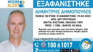 Στις 19/04/2023, εξαφανίστηκε από την περιοχή της Αργυρούπολης στην Αθήνα, ο Δημήτρης Δημόπουλος, 58 ετών.