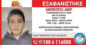 Στις 5/11/2020 και ώρα 18:30, εξαφανίστηκε από την περιοχή της Γλυφάδας Αττικής, ο Αμπντούλ Αθίρ, 11 ετών. Το «Χαμόγελο του Παιδιού» ενημερώθηκε για την εξαφάνιση του ανήλικου Αμπντούλ Αθίρ, σήμερα στις 6/11/2020 και προχώρησε άμεσα στην ενεργοποίηση του μηχανισμού AMBER ALERT HELLAS κατόπιν Εισαγγελικής Εντολής. Ο Αμπντούλ Αθίρ έχει μαύρα μαλλιά, μαύρα μάτια, ύψος 1.55 και 60 κιλά. Την ημέρα που εξαφανίστηκε φορούσε μαύρο πουκάμισο, μαύρο παντελόνι και μαύρα αθλητικά παπούτσια.