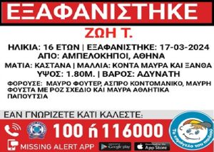 Στις 17 Μαρτίου 2024, πρωινές ώρες, εξαφανίστηκε από την περιοχή των Αμπελοκήπων στην Αθήνα, η Ζωή Τ., 16 ετών.