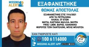 Στις 19 Ιουνίου εξαφανίστηκε από την περιοχή Πετράλωνα, ο 37χρονος Θωμάς Αποστολάς, σύμφωνα με τον Οργανισμό «Χαμόγελο του Παιδιού».