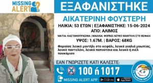 Αγωνία στον Άλιμο από την εξαφάνιση της 53χρονης Κατερίνας Φουστέρη το πρωί του Σαββάτου (15/06/2024), όπως ανακοίνωσε το «Χαμόγελο του Παιδιού».