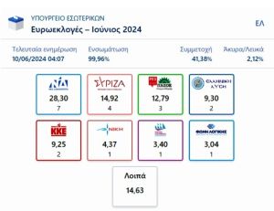 Συγκεκριμένα, βάσει των αποτελεσμάτων των Ευρωεκλογών της 9ης Ιουνίου, η Νέα Δημοκρατία εκλέγει επτά ευρωβουλευτές, ο ΣΥΡΙΖΑ τέσσερις, το ΠΑΣΟΚ τρεις, το ΚΚΕ και η Ελληνική από δύο, η Νίκη και η Πλεύση Ελευθερίας, ενώ η Φωνή Λογικής φαίνεται να κερδίζει τη μάχη στο όριο και να εκλέγει έναν.