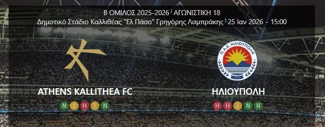 ΣΗΜΕΡΑ, ΚΥΡΙΑΚΗ 25.01.2026 ΚΑΙ ΩΡΑ 03.00 Μ.Μ. Η ΟΜΑΔΑ ΤΗΣ ΗΛΙΟΥΠΟΛΗΣ ΑΝΤΙΜΕΤΩΠΙΖΕΙ ΕΚΤΟΣ ΕΔΡΑΣ ΤΗΝ ΟΜΑΔΑ ΤΗΣ ΚΑΛΛΙΘΕΑΣ ΣΤΑ ΠΛΑΙΣΙΑ ΤΗΣ 18ΗΣ ΑΓΩΝΙΣΤΙΚΗΣ ΤΗΣ SUPER LEAGUE 2.