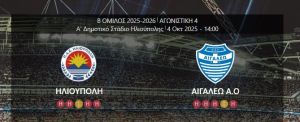 Σήμερα, Σάββατο 04.10.2025 και ώρα 02.00 μ.μ. η ομάδα της ΗΛΙΟΥΠΟΛΗΣ αντιμετώπισε εντός έδρας την ομάδα του ΑΙΓΑΛΕΩ για την 4η αγωνιστική της Super League 2