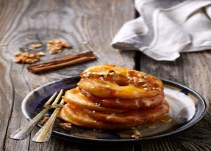 - Απλώνουμε τους μηλολουκουμάδες σε μια πιατέλα, τους περιχύνουμε με μέλι, τους πασπαλίζουμε με κανέλα και καρυδόψιχα και σερβίρουμε.