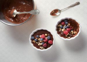 Ένα πανεύκολο, comfort γλυκό. Μια κρέμα σοκολάτας που γίνεται στην κατσαρόλα και γαρνίρεται με φουντούκια και φρούτα.
