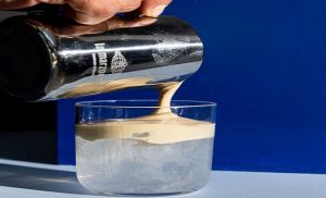 - Σε ένα μικρό σέικερ βάζουμε την κρέμα γάλακτος και τον εσπρέσο και χτυπάμε στην φραπιέρα μέχρι το μείγμα να γίνει λείο και κρεμώδες. Δεν θέλουμε να γίνει πολύ σφιχτό ώστε να μπορεί αργότερα να ομογενοποιηθεί με το νερό καρύδας.