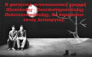 Από Τετάρτη 14/12/2022, η φοιτητική συγκοινωνιακή γραμμή Ηλιούπολης - Πανεπιστημιούπολης - Πολυτεχνειούπολης, θα παραμείνει εκτός λειτουργίας.