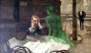 Οι παρενέργειες του ποτού, απεικονίζονται με μαεστρία στον πίνακα του Oliva, στον οποίο φαίνεται ένας άντρας χαμένος στις σκέψεις του, να ατενίζει με δέος μία γυμνή πράσινη γυναίκα, που κάθεται σαγηνευτικά στο τραπέζι του.