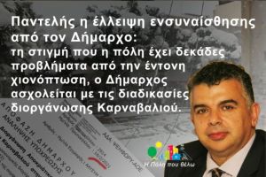 Παντελής η έλλειψη ενσυναίσθησης από τον Δήμαρχο: τη στιγμή που η πόλη έχει δεκάδες προβλήματα από την έντονη χιονόπτωση , ο Δήμαρχος ασχολείται με τις διαδικασίες διοργάνωσης Καρναβαλιού.