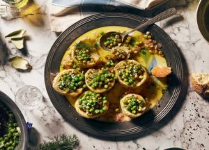 Οι τρυφερές αγκινάρες της εποχής και μια πράσινη, γέμιση με ρύζι, αρακά και μυρωδικά σε ένα θαυμάσιο πιάτο με τη γεύση της άνοιξης.