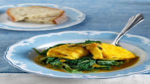 - Σουρώνουμε τη σάλτσα πάνω από το ψάρι και σερβίρουμε, το ψάρι παπατζίδικο με ξίδι και σαφράν, με χόρτα εποχής βραστά και ρύζι.