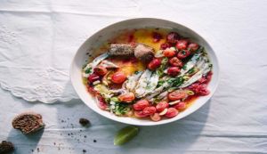 - Σε σχετικά βαθιά πιατέλα τακτοποιούμε τον γαύρο και από πάνω ρίχνουμε τα σοταρισμένα σταφύλια.