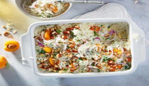 Πλούσιο σαλατογεύμα με φουρνιστό ρύζι, για καπνιστή νοστιμιά και άρωμα, τραγανούς ξηρούς καρπούς, ζουμερά γλυκόξινα βερίκοκα και μπόλικα μυρωδικά.