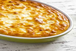 - Ψήνουμε στον φούρνο για περίπου 30 λεπτά ή μέχρι να λιώσει και να χρυσίσει το τυρί στην επιφάνεια. Το σουφλέ βγαίνει ελαφρώς ζουμερό.