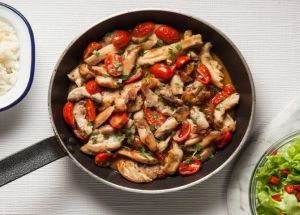 - Ανακατεύουμε απαλά, σκορπίζουμε το βασιλικό και μαγειρεύουμε για άλλα 5 λεπτά, μέχρι να μελώσουν τα ντοματάκια και να γίνει το κοτόπουλο.