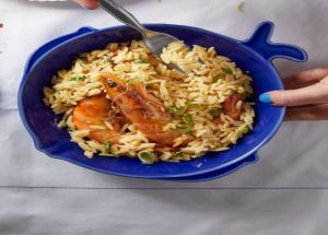 Ένα υπέροχο γιουβέτσι με κριθαράκι και γαρίδες, νόστιμο, ελαφρύ και μελωμένο, αλλά σπυρωτό και με ωραία υφή.