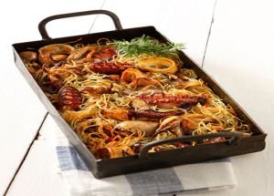 - Ανάλογα με το μέγεθός τους, τα θαλασσινά χρειάζονται 40 – 60 λεπτά ψήσιμο. Τα δοκιμάζουμε τσιμπώντας με πιρούνι και τότε υπολογίζουμε τα υγρά του ταψιού και προσθέτουμε βραστό νερό, να είναι συνολικά 3 ποτήρια.